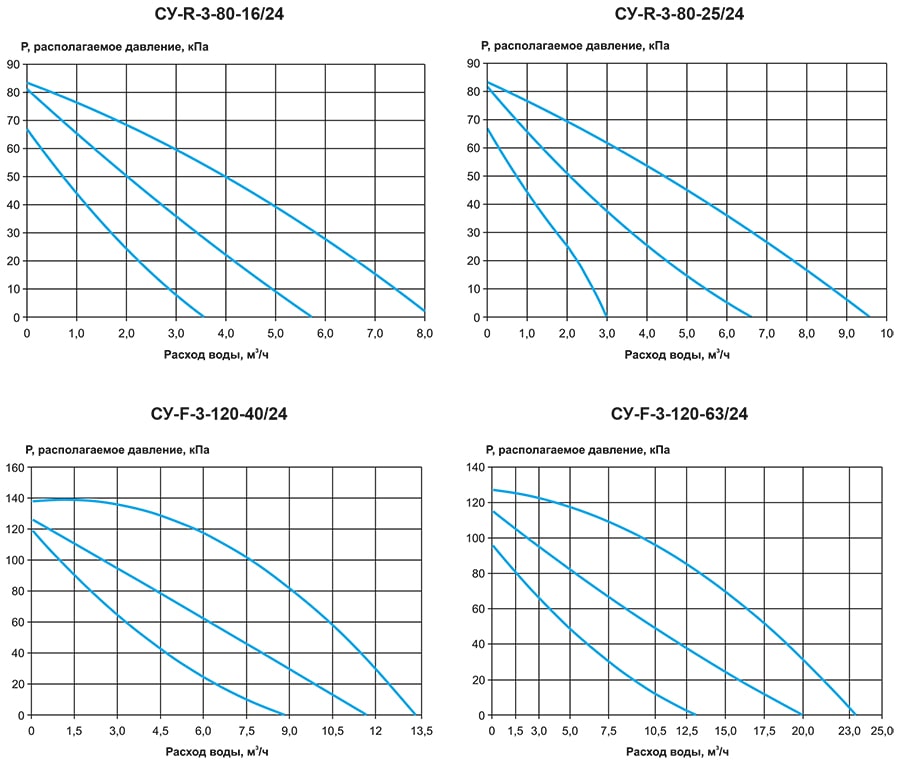 Для подбора смесительного узла нужно знать необходимый расход теплоносителя в м3/ч и суммарные потери давления в нагревателе в кПа, на основе этих данных по вышеприведенным графикам подбираем смесительный узел так, чтобы точка нагревателя (расход, давление) находилась ниже и левее одной или несколько линий графика смесительного узла, оптимально в зоне двух третьих характеристики, ближе к правому краю.